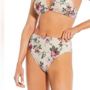 Elegant bikini with a floral design. Cream base with green and red accents. Ideal for summer wear.