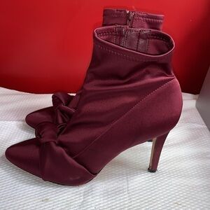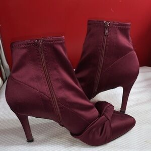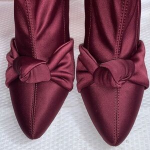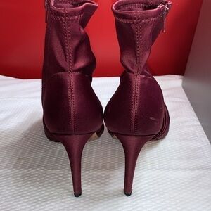 Satin fabric uppers with leather soles. Boots have a side zipper.