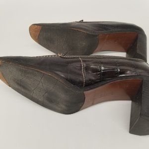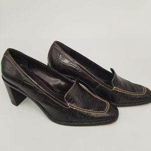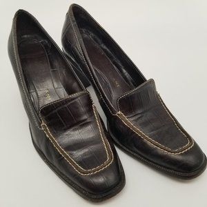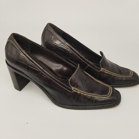 ANTONIO MELANI BROWN ALLIGATOR LEATHER LOAFERS WITH 2.5" HEEL. LEATHER UPPERS AND SOLE. GOOD CONDITION. SPORTY & SOPHISTICATED. COMING FROM A SMOKE FREE HOME.
