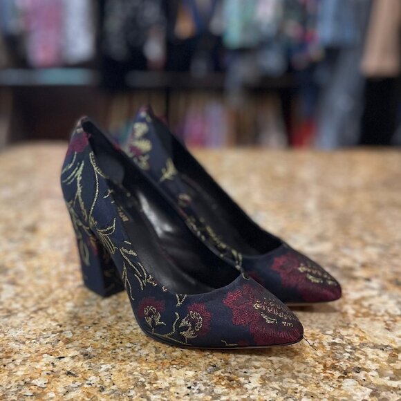 ANTONIO MELANI Navy, Gold and Dark Red Damask Pump with 3.5" block heel. Size 5, Never been worn. Please see photos for more details.