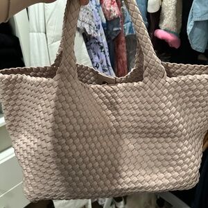 Elegant woven design. Soft pink hue. Spacious interior. Comfortable handles.