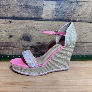 Stylish pink and tan wedges with espadrille design. Perfect for casual outings.