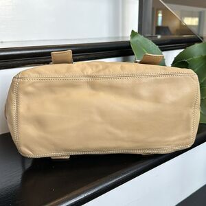 Stylish tan handbag with silver stud accents. Features dual handles and buckle details.