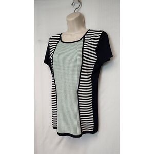 ANTONIO MELANI Navy Blue Round Neck Striped Blouse Cap Sleeve Size M