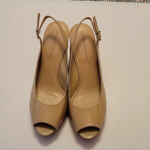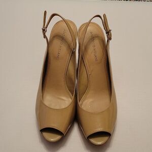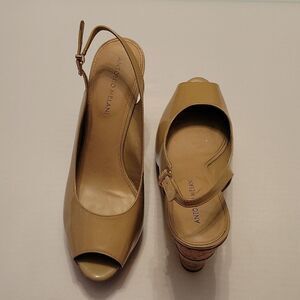 ANTONIO MELANI LEATHER PATERN SLINGBACK PEEP TOE WEDGE SANDAL COLOR TAN SIZE 10M 4"HEEL HEIGHT MEASUREMENTS CORK WEDGE HEEL PATERN ACCENT PLASFORM SOLE WITH ADJUSTABLE BUCKLE THIS ITEMS IS PRE-OWNED EXCELLENT CONDITION WITH ONLY LIGHT SIGNS OF WEAR IF ANY CHECK THE PICTURES