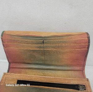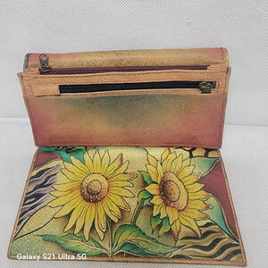Anuschka hand painted leather wallet. The wallet has the daisy pattern. The wallet is in great condition. There are 11 slide pockets for cards and a slide pocket for your driver's license. There are 2 zippered pockets. 4 slides for paper money 💰 and your checkbook. There is a s ap closure. Please see all pictures.