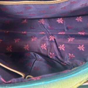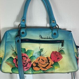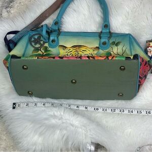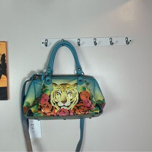 Vibrant satchel with a bold tiger and floral design. Features teal handles and colorful artwork. Perfect for a statement look.