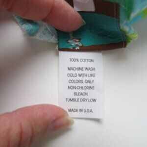 • blue, green & white geometric print a-line shift dress; sleeveless; decorative double ruffle down the front; pull-on with a button at the back of neck; Made in USA