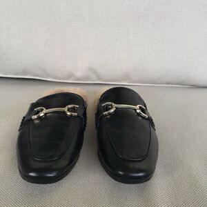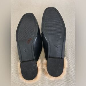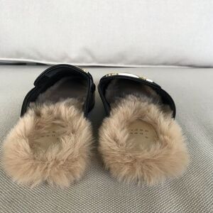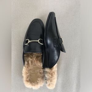 Elegant black loafers with plush tan faux fur lining. Gold-tone hardware adds a touch of sophistication.