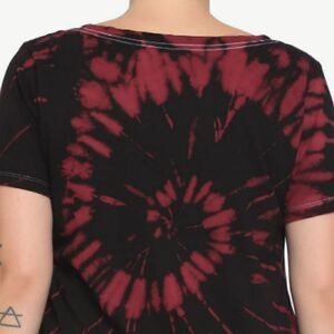 This cropped tie-dye Freddy Krueger top features an image of Freddy Krueger, film logo and "Never sleep again" on a red and black tie-dye wash.