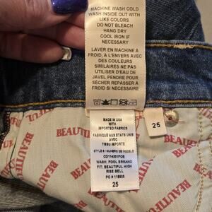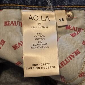AO LA by Alice + Olivia Womens Jeans Size 25 Beautiful High Rise Bell in Blue. 98% Cotton and 2% Elastane, machine wash. Stretch with a 4 pocket design and button & zip closure. Whiskering and fading with very slight distressing and raw hems. New with tags.