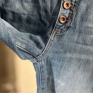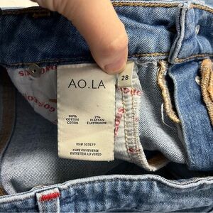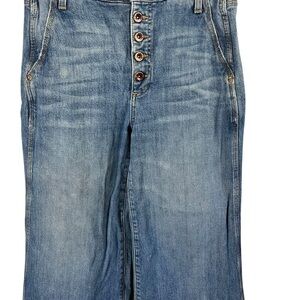 AO LA x ALICE + OLIVIA High Rise Cropped Wide Leg Jeans in Night Moves. Exposed button fly. Frayed raw hem. Flared wide leg. Medium wash with varied fading and light distressing (irregular dye spots are all by design). Buttons have intentional partial "tarnishing".