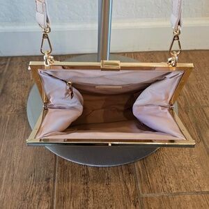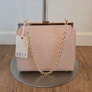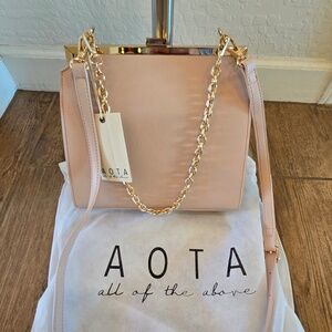 NWT! Never used...BRAND NEW! Anthropologie "AOTA" (All of the above) shoulder bag. Beautiful light pink/blush color, shiny gold hardware, kiss-lock closure, interchangeable and removable gold chain strap and cross body adjustable strap, gold accent protective feet, classic and structured square shape, one interior zip pocket and one interior slip pocket, 100% recycled polyurethane construction with 100% recycled cotton lining. 9" W x 9" H x 2.5 " D. No odors or stains. NOTE*** there are EXTREMELY minor impression marks on one side (see last picture) from chain strap during shipping. BEAUTIFUL bag that can be dressed up or down Classic and Cute!