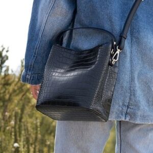 With its slightly structured shape and mock croc texture, this bucket bag will carry your daily essentials in the chicest way.