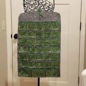 -New with Tags Hanging Animal Print Jewelry Organizer-Double Sided by Sheffield Home-Home & Design. Black & white leopard print with kelly green accents and Multiple clear pockets with large pockets on bottom.