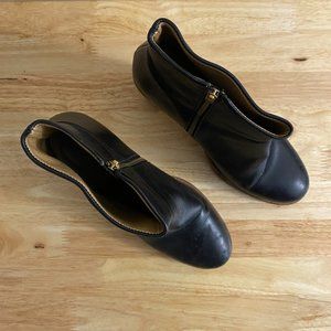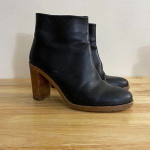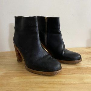 A.P.C. Black Leather Boot Size 38 with a wooden heel and trim. In good condition. The heel is 3in but a block heel so very comfortable.