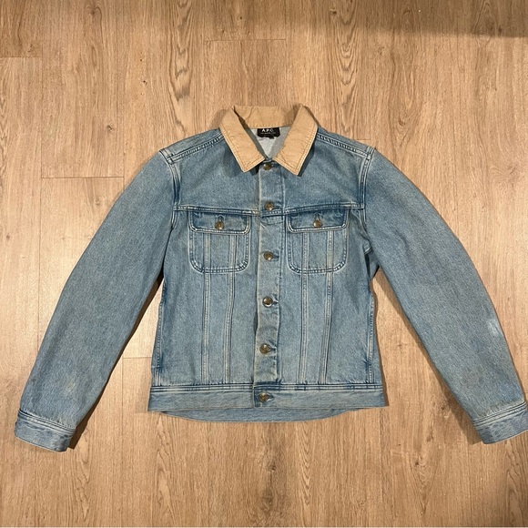 🔥 Classic A.P.C. denim jacket featuring a timeless light wash and tan corduroy collar detail. Perfect layering piece for casual or elevated looks. Premium construction with button-front closure, dual chest flap pockets, and clean lines.