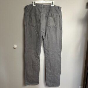 A.P.C. gray straight leg jeans in good used condition—no noticeable flaws or imperfections aside from some spot of slight discoloration (see photos)). Made from 100% cotton fabric.