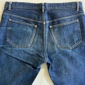Lightly worn in. Stonewashed Japanese stretch denim. Interior of fabric trimmed with selvage over entire length. Orange topstitching. 98% Cotton. 2% Polyurethane. Unisex jeans. Straight leg. Straight mid-rise. Five pockets, button fly. The first button is engraved "A.P.C. rue Madame près du Luxembourg". 12.75 oz. Machine wash. Do not tumble dry.