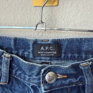 A.P.C. unisex New Standard slim-straight dark wash jeans. Crafted from 100% cotton Japanese denim with minimal fading and a clean indigo wash. Features a button fly, five-pocket design, and signature minimalist tailoring. Made in Macau. Gently worn with light distressing and soft fade for authentic character. Size 32 - 16" waist; 10" rise; 32" inseam.