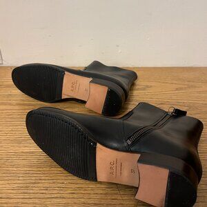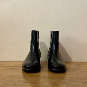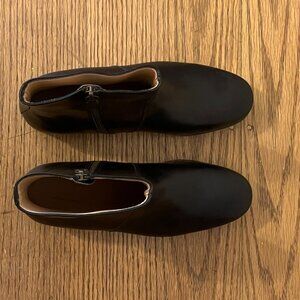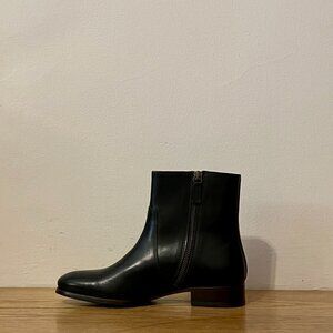 New and Unused / Smooth leather ankle boot with exposed side zip / Slightly tapered round toe / Curved overlay at front / Center front seam detail / Strip at center back / Tonal stitching throughout / Leather insole & lining / Low, approx. 1" stacked heel with rubber tap / Made in Portugal