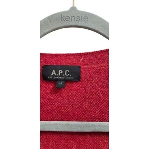 The product is a stylish A.P.C. wool red cardigan for women in size M. This sweater features a classic cardigan style, made from high-quality wool material that provides warmth and comfort. The bold red color adds a pop of color to any outfit, making it a versatile and fashionable piece for any wardrobe. Perfect for layering over tops or dresses, this cardigan is a timeless addition to any woman's clothing collection.