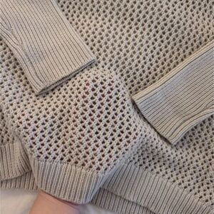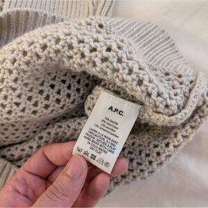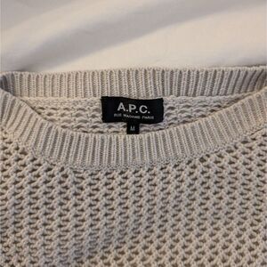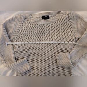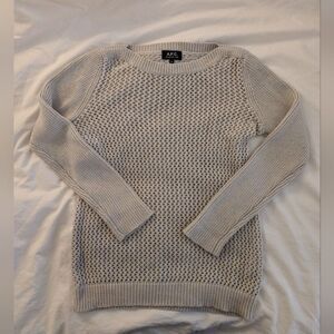 A unique silk blend sweater in fishnet knit from APC! Lovely gray color and extremely soft to the touch. I usually wear a t shirt underneath but you can get away with just nude bra as the knit creates a illusion and is not totally see though. Very good used condition.
