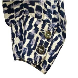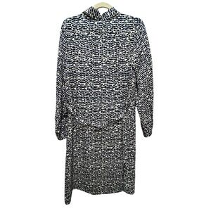 Minimalist chic meets vintage Parisian flair in this A.P.C. x Vanessa Seward collab shirt dress. Features a modern navy-and-white abstract print, button-down front, tailored collar, and sleeve cuffs with button detail. Comes with a matching belt for a cinched silhouette or wear loose for effortless cool.