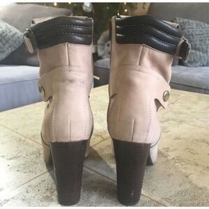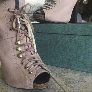 APEPAZZA Suede Combat Bootie Tan Leather Peep Toe Boot Size 7