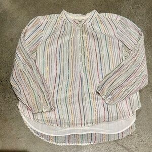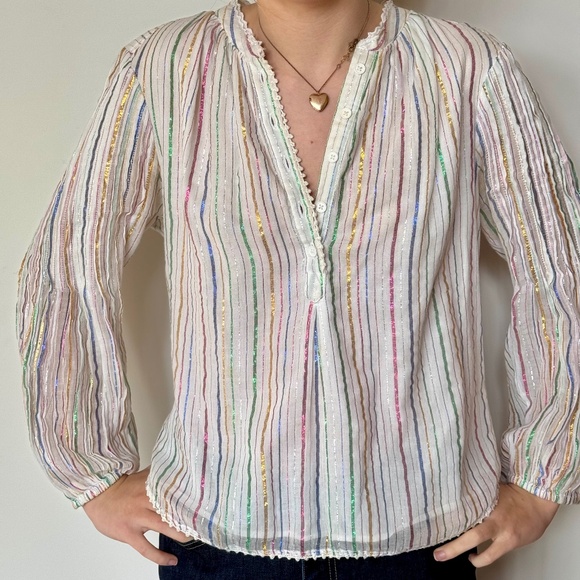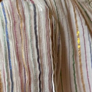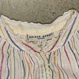 Apiece Apart button down blouse with gorgeous details and sparkle- metallic multi-colored stripes. There is a sweet stitched ruffle around the bottom and collar and pin tucking at the top of the sleeves. It's in excellent condition. It's a size 2 which is a medium.