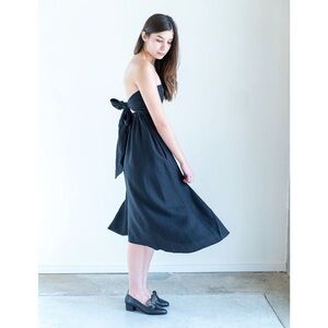 The Cosmos Convertible Dress in black from Apiece Apart. We absolutely love this classic piece, it can be worn as both a dress and a skirt! This piece can be worn as a strapless dress or layered over your favorite silk blouse, or even as a high-waisted skirt. Pull on style, with a tie at the back for a dress or wrap around tie as a skirt, with elastic at the back of the waist and side pockets. Unlined. Our model is 5'9" and wears a size 2. Measurements for a size 4: 40" long and 13.5" across the wait when flat and unstretched. 35% tencel, 65% tencel. Dry clean only.
