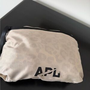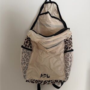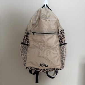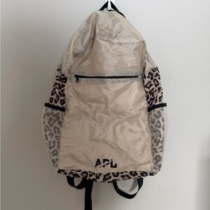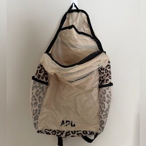 NEW. Chic APL backpack with leopard print details. Includes front and back zipper pockets with adjustable straps. This is a packable backpack.