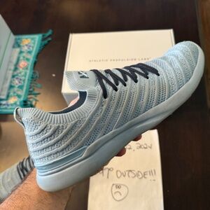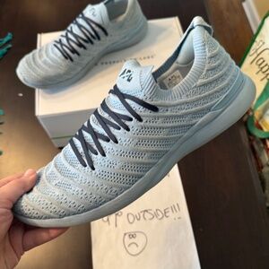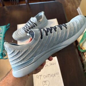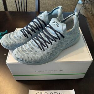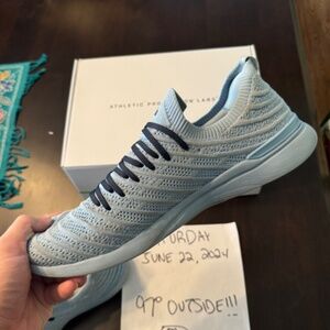 Stylish APL athletic shoes. Light blue knit design. Comfortable and breathable. Perfect for sports and casual wear.