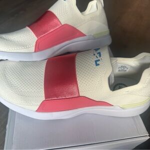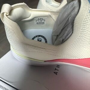APL sneakers are brand new with the box in size 14. There seems to be a tiny little blemish on the very top of the left shoe that you really can barely see. It looks like the coral color from the shoe. Refer to picture 9. I put new with tags because these are new with the original box.