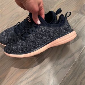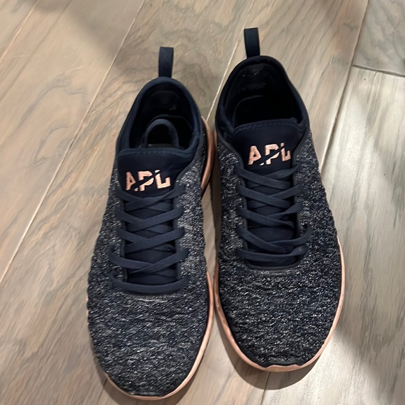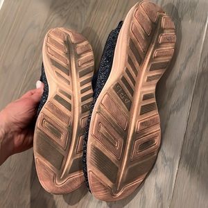 Great pre owned condition. See photos for wear. Outside fabric has no stains or holes. Shimmery blue color with peach soles.