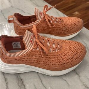 Vibrant orange sneakers with a knit design. Features a comfortable fit.