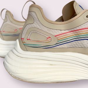 Athletic Propulsion Labs, APL Women's Streamline Running Shoes. Size 10.5. Color: Alabaster/Peacock/Multi. Preowned, some scuffs and marks as expected from use, but overall good condition.