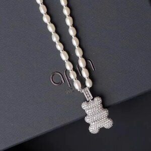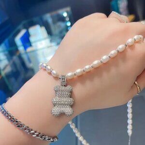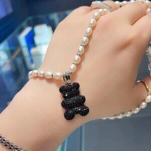 This necklace is handcrafted from sterling silver and embellished with fresh water pearls. The Yummy bear is paved with white cubic zirconia on one face and black spinel on the other.