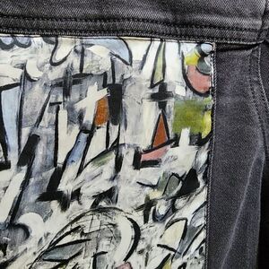 APNY Denim Jacket Women S Black Cotton Blend Graffiti Frayed Button Distressed