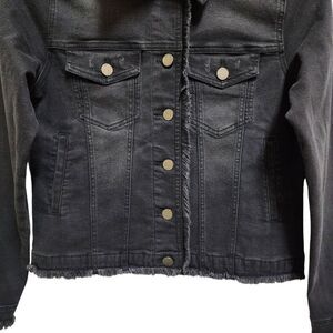 APNY Denim Jacket Womens Size S Black Cotton Blend Stretch Denim Trucker Abstract Frayed Hem Button Western Chic Cowgirl Ranch Casual Rodeo Streetwear