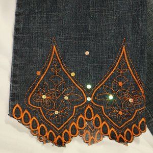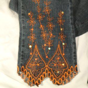 Beautiful pair of jeans with sequin touches and lots of contrast color stitching on the bottoms and pockets. Clean throughout. Smoke and pet free.