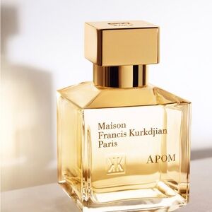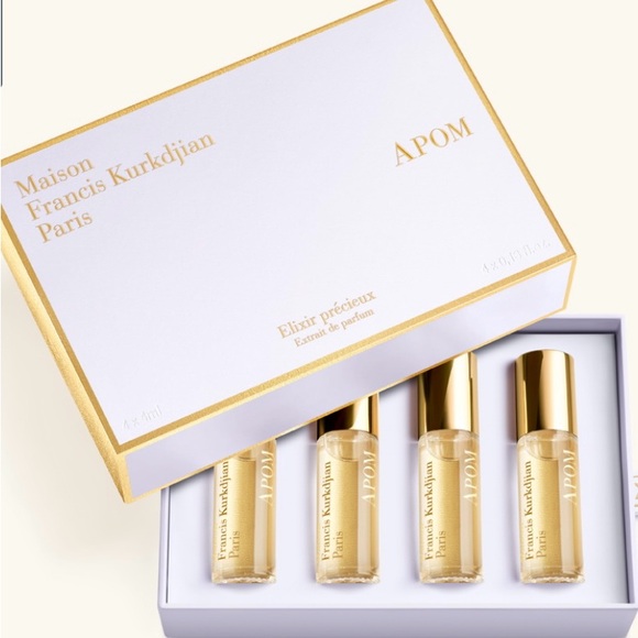 Set of four travel vials from Maison Francis Kurkdjian APOM. Elegant white and gold presentation box. Ideal for gifting or fragrance sampling.