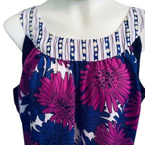 This vibrant Apostrophe women’s sleeveless blouse features a bold floral print in shades of fuchsia, navy blue, and black with a contrast striped scoop neckline. Lightweight polyester with a semi-sheer black trim hem gives it a flowy, flattering fit.