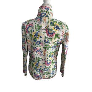 This stylish reversible jacket features a vibrant floral design and quilted pattern. Perfect for adding a pop of color to any outfit, this medium-sized jacket offers comfort and versatility.