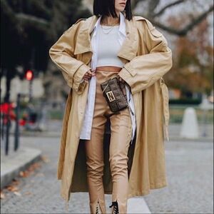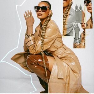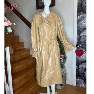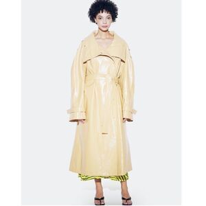 An exaggerated collar, oversized fit and patent faux-leather finish give this trench an ultra-glam look.