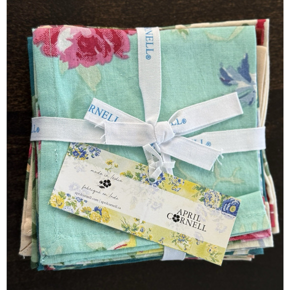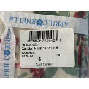 This a NEW beautiful set of APRIL CORNELL Cocktail Napkins! Set of 6 Lovely Floral Collection. I didn't want to take the napkins out of their wrapping, so I tried to get a picture of a corner of each of the napkins. Please let me know if you would like other pictures.