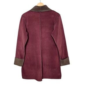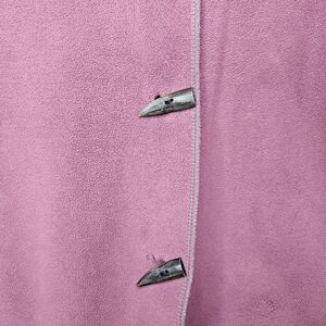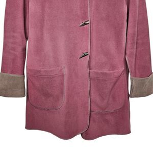 Apsara Women's reversible fleece coat. Pockets on both sides. Purple side closes with 3 horn shaped buttons. Taupey gray side can be worn open (no button closure on that side). The taupey gray color is most accurately depicted in the closeup pictures of the labels (appears more brown in the other pictures). Very good pre-owned condition. Small discolored spot on the lower back of the purple side (see photo).