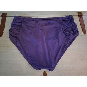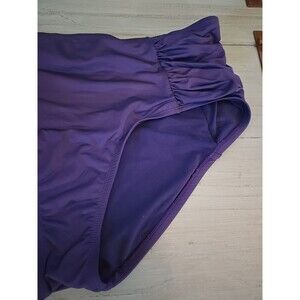 The product is Apt. 9 Blue High Rise swim suit bottoms in size 1X. It features a solid blue color with a high-waisted design and is made of polyester, spandex, and nylon. The garment care is machine washable, and it is lined for added comfort. This plus-size bottom is designed for women with a D cup size and has a spaghetti strap style.