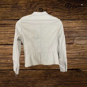 This stylish leather look jacket from Apt. 9 is a cream color with silver zipper accents. Zippered front and pockets. Interior has satin lining. Worn 3x. Excellent smoke free condition.