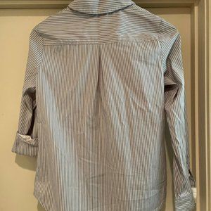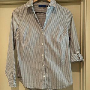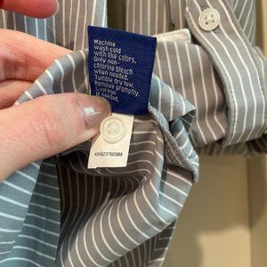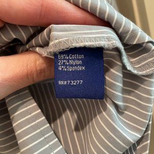 This button up is in great condition, other than one stain. SEE PHOTOS for one small stain on one sleeve. Otherwise, the subtle white stripe on the soft gray background makes for a blouse that is so versatile for your workday. Roll tab sleeve,. or leave them long! 69% Cotton/27% Nylon/ 4% Spandex.